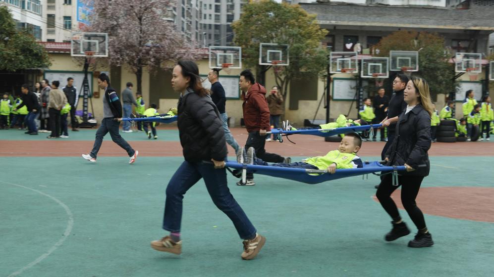 在“开学嗨两天”趣味运动会上,家长在参与“抬小猪”项目。受访者供图