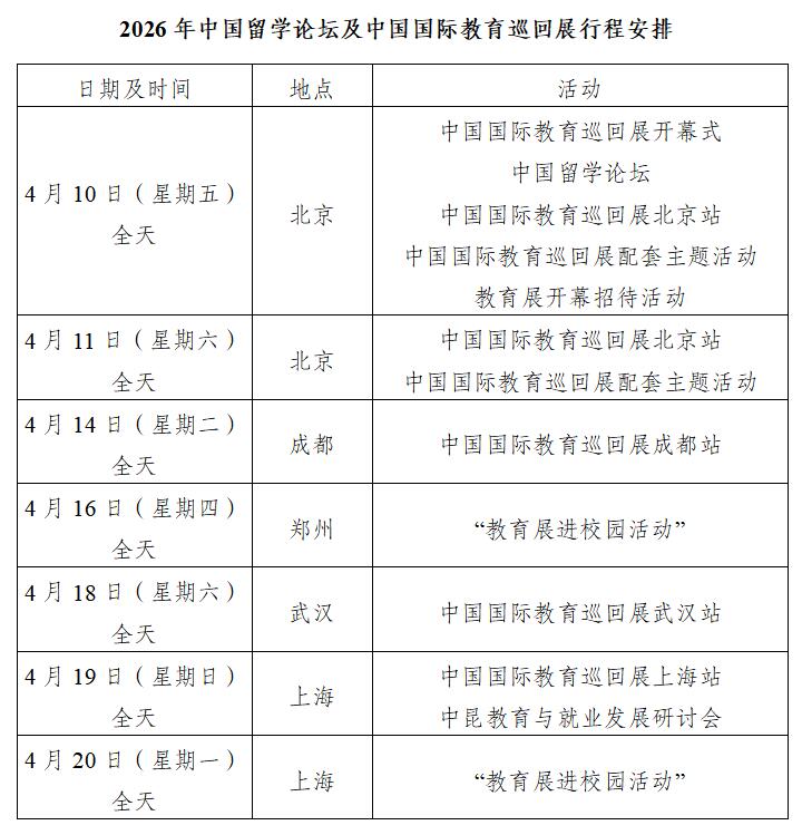 4月10日,“2026年(第二十二届)中国留学论坛”暨“2026年(第三十一届)中国国际教育巡回展”开幕式将在北京国家会议中心举办。本次巡回展以“开放·协作·共赢:推动留学教育实现可信任、更安全、高质量发展”为主题,由中国(教育部)留学服务中心主办,随后将在成都、郑州、武汉、上海四地依次开展,持续至4月20日。